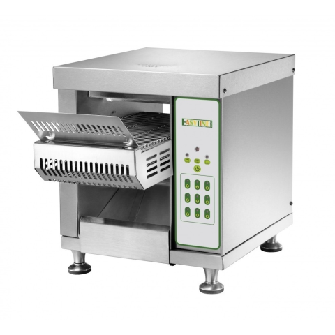 Szalagos toaster, rozsdamentes acél kialakítás kívül-belül, kvarclámpás melegítés, digitális vezérlés. Sütési idő: 90-340 másodperc. Szalag méret: 180 mm. Kapacitás: 90-150 db/óra. Teljesítmény: 1,3 kW/230V-1N~. Mérete: 340x690x400 mm. Súly: 14 Kg.