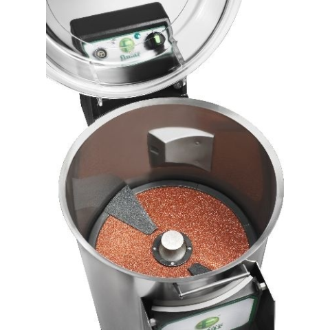 Inox ház, rozsdamentes belső alkatrészek, polikarbonát fedő, kisfeszültségű vezérlőpanel, biztonsági kapcsolókkal, műanyag rögzítőfülek és fogantyú, automatikus vízsugár a héj eltávolításához, elülső ürítőnyílás, alsó/hátsó vízkieresztés. Időzítő: 0-4 perc Kapacitás: 18 kg/töltet illetve 220 kg/óra Teljesítmény: 1,1 kW/230V-1N~ Mérete: 400x770x930 mm