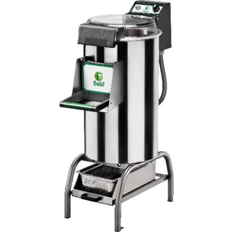 Inox ház, rozsdamentes belső alkatrészek, polikarbonát fedő, kisfeszültségű vezérlőpanel, biztonsági kapcsolók, állvánnyal, műanyag rögzítőfülek és fogantyú, automatikus vízsugár a héj eltávolításához, elülső ürítőnyílás, alsó/hátsó vízkieresztés. Időzítő: 0-4 perc Kapacitás: 25 kg/töltet illetve 450 kg/óra Teljesítmény: 1,1 kW/230V-1N~ Mérete: 450x900x1355 mm