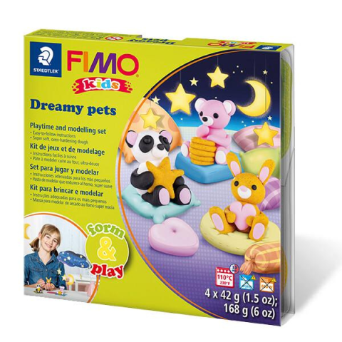 FIMO Kids Form and Play álom készlet lépésről-lépésre útmutatóval, színes háttérképpel.