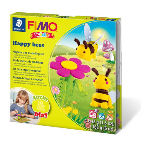 FIMO Kids Form and Play méhek készlet lépésről-lépésre útmutatóval, színes háttérképpel.