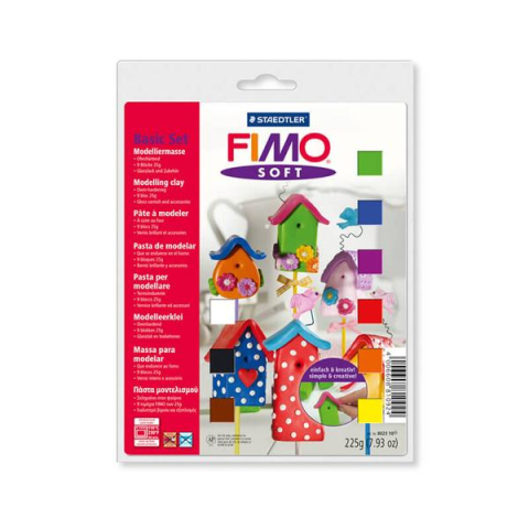 FIMO Soft kiégethető gyurmakészlet. Puha, könnyen keverhető gyurma, háztartási sütőben 110 oC fokon 30 percig kell kiégetni. A készlet tartalmaz még egy fényes lakkot és egy modellező szerszámot.