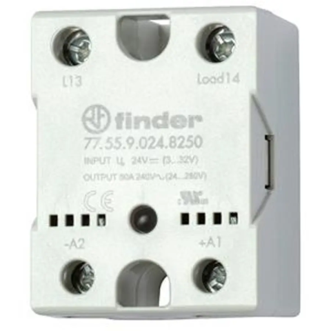 Elektronikus (SSR) relé, "hoki pakk" kivitel, hűtőbordára rögzíthető, névleges feszültség: (90...280)V AC, 1 záróérintkező 50 A, max. bekapcsolási áram: 520 A - 10 ms, kapcsolási feszültségtartomány: (48...600)V AC, kapcsolás feszültség-nullátmenetben, érintkezőterhelés: izzó- / halogénlámpa: 6.000 W, kompakt fénycső: 4.000 W, LED (230 V AC): 4.000 W, kisfesz. halogénlámpa vagy LED elektronikus előtéttel: 4.000 W, kisfesz. halogénlámpa vagy LED hagyományos