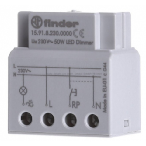 Finder 15.91.8.230.0000 Dimmelhető elektronikus relé Elektronikus dimmer, mélyített készülékdobozba szerelhető, fázishasításos dimmelés gyujtásszög vezérléssel, megengedett terhelés: izzó - / halogénlámpa (230 V): 100 W, dimmelhető LED fényforrá