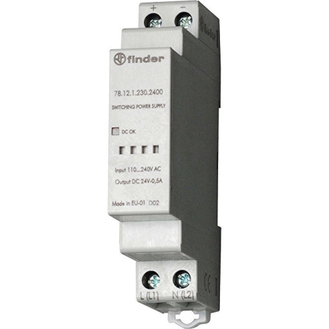 Finder 78.12.1.230.1200 Tápegység \nKapcsolóüzemű tápegység, 35 mm-es szerelősínre pattintható, csavaros csatlakozókkal, bemenet: (110...240) V AC vagy 220 V DC, AC feszültségnél kapcsolás a feszültség nullátmenetekor, kimenet: 12 W - 12 V DC,