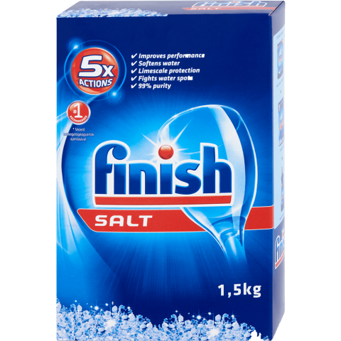 A Finish vízlágyító só segít megelőzni a veszélyes vízkőlerakódások kialakulását a mosogatógépben és az edényeken. A kemény víz a rejtett részeken vízkőlerakódásokat okoz, ami csökkenti a mosogatógép mosási teljesítményét. A Finish regeneráló só 100%-k