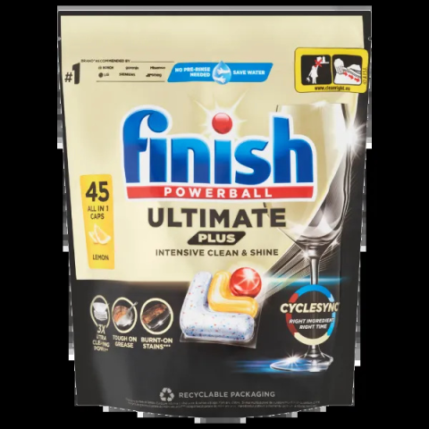 Finish Ultimate Plus All in 1 Lemon mosogatókapszula CYCLESYNC™ technológiával készült, amely a megfelelő időben szabadítja fel a megfelelő összetevőket a három különböző kamrából. Formulája megbirkózik a ráégett ételmaradékkal is előöblítés nélkül. A kapszula védi és tisztán tartja az üvegedényeket és evőeszközöket is, megőrizve csillogásukat minden mosogatás után. Átlagosan 15%-kal kevesebb vegyi anyagot tartalmaz, mint a Finish Power tabletta.
