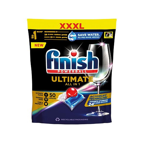 Mosogatógép tabletta - prémium, gélkapszula, All in 1, 50 db a csomagban Finish Ultimate All In One mosogatógép kapszulákA legjobb a mosogatógépednek! Tökéletes tisztaság és mosogatógép-védelem a legkeresettebb Finish automata mosogatógép márkának köszönhetően. Az alábbi m