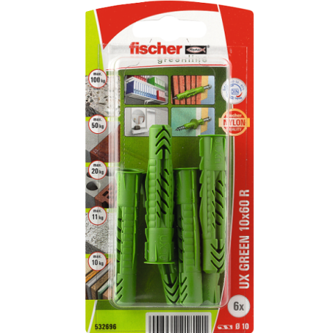 Dűbel "FISCHER UX GREEN" - 6db 10x60mm dűbel - elő és átmenő szereléshez - feszítés, alakformálódás, csomósodás - alkalmazható: beton, tégla, gipszkarton, üreges födém, terméskő, forgácslap
