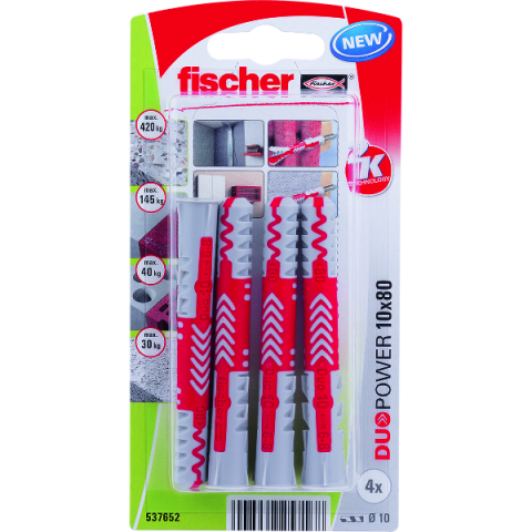 Dűbel "FISCHER DUOPOWER" - 4db 10x80mm dűbel - elő és átmenő szereléshez - feszítés, alakformálódás, csomósodás - alkalmazható: beton, tégla, gipszkarton, üreges födém, terméskő, forgácslap