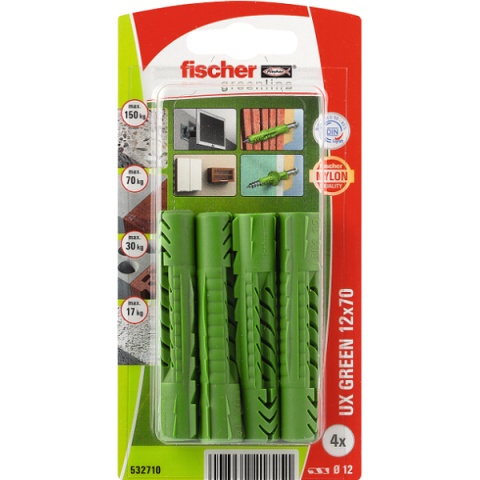 Dűbel "FISCHER UX GREEN" - 4db 12x70mm dűbel - elő és átmenő szereléshez - feszítés, alakformálódás, csomósodás - alkalmazható: beton, tégla, gipszkarton, üreges födém, terméskő, forgácslap