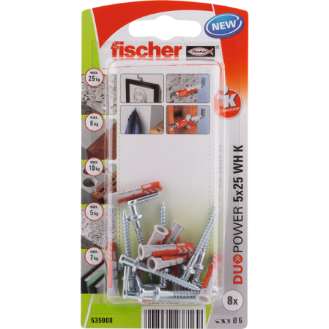Dűbel "FISCHER DUOPOWER" - 8db 5x25mm dűbel 8db körkampóval - elő és átmenő szereléshez - feszítés, alakformálódás, csomósodás - alkalmazható: beton, tégla, gipszkarton, üreges födém, terméskő, forgácslap
