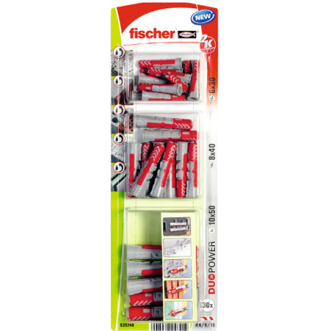 Dűbel "FISCHER DUOPOWER" - 30db:15db 6x30mm, 10db 8x40mm, 5db 10x50mm dűbel csavarral - elő és átmenő szereléshez - feszítés, alakformálódás, csomósodás - alkalmazható: beton, tégla, gipszkarton, üreges födém, terméskő, forgácslap