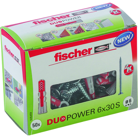 Dűbel "FISCHER DUOPOWER" - 50db 6x30mm dűbel - elő és átmenő szereléshez - feszítés, alakformálódás, csomósodás - alkalmazható: beton, tégla, gipszkarton, üreges födém, terméskő, forgácslap