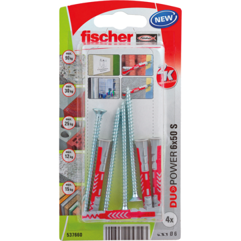 Dűbel "FISCHER DUOPOWER" - 4db 6x50mm dűbel 4db csavarral - elő és átmenő szereléshez - feszítés, alakformálódás, csomósodás - alkalmazható: beton, tégla, gipszkarton, üreges födém, terméskő, forgácslap
