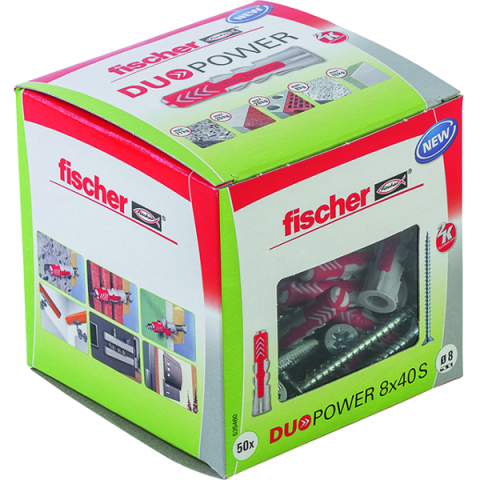 Dűbel "FISCHER DUOPOWER" - 50db 8x40mm dűbel 50db csavarral - elő és átmenő szereléshez - feszítés, alakformálódás, csomósodás - alkalmazható: beton, tégla, gipszkarton, üreges födém, terméskő, forgácslap
