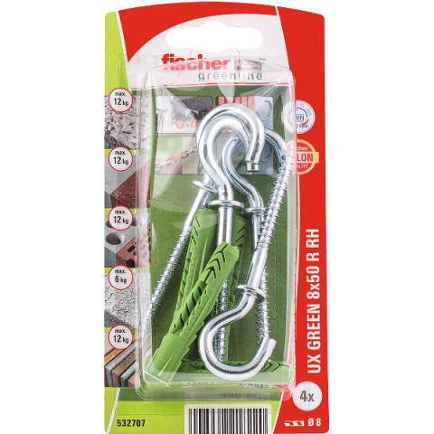 Dűbel "FISCHER UX GREEN" - 4db 8x50mm dűbel 4db kampóval - elő és átmenő szereléshez - feszítés, alakformálódás, csomósodás - alkalmazható: beton, tégla, gipszkarton, üreges födém, terméskő, forgácslap