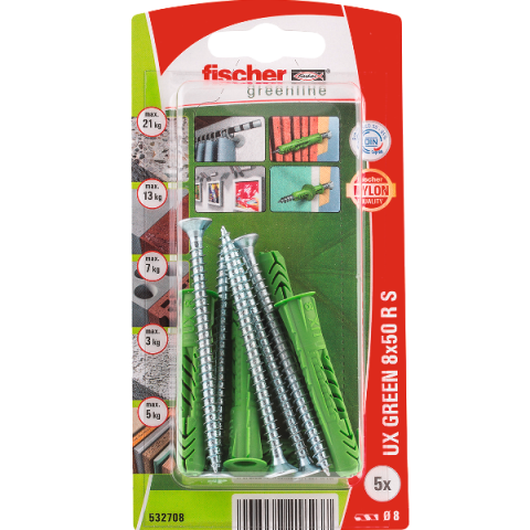 Dűbel "FISCHER UX GREEN" - 5db 8x50mm dűbel 5db csavarral - előszereléshez - terpesztés, csomósodás - alkalmazható: beton, tégla, gipszkarton, üreges födém, terméskő, forgácslap