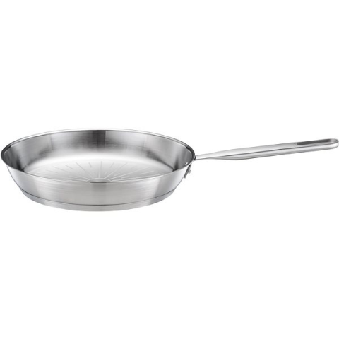 Serpenyő - rozsdamentes, kerek, használható elektromos, gáz, üvegkerámia és indukciós főzőlapon, alkalmas sütőbe és mosogatógépben mosható, rozsdamentes acél külső felület, ergonomikus, rozsdamentes acél fogantyú, megerősített fenék, maximális sütési hőmérséklet a sütőben 270 °C, méretei 4,5 × 51 cm (ma × h), serpenyő felső szélének átmérője 28 cm, serpenyő aljának külső átmérője 23,4 cm, inox kivitel A Fiskars serpenyő egy univerzális konyhai