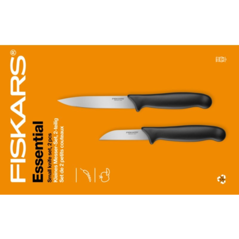 Fiskars Essential 2 db-os hámozókészlet 1 db könnyű, praktikus kés egyenes pengével, mely ideális zöldségek és gyümölcsök hámozásához és darabolásához, valamint zöldségdíszek kialakításához, és 1 db sokoldalú kés egyenes pengével és középen elhelyezk