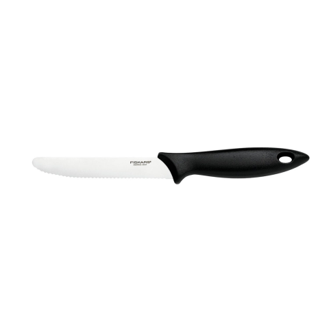 Fiskars Essential paradicsomszeletelő kés 12 cm. Közepes méretű, recézett pengéjű kés puha, vékony héjú zöldségek vágásához. Általános asztali késként is használható.