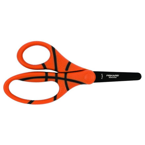 Fiskars gyerekolló kosárlabda motívummal, 13 cm hosszú eszköz (200670). A nyél kifejezetten kicsi kezekhez lett kialakítva. Jobb és balkezeseknek egyaránt ajánlott.