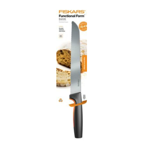 Kenyérvágókés, 21 cm, FISKARS Functional Form fekete (IF1057538) Hosszú, fogazott pengéjű kés, mellyel a ropogós kenyérhéj is könnyedén vágható. -tartós japán rozsdamentes acél penge -biztonságos ergonomikus markolat -mosogatógépben elmosható -kényel