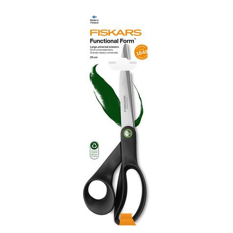 Olló, általános, 25 cm, FISKARS Functional Form Renew, fekete A Fiskars Functional Form ReNew univerzális olló újrahasznosított anyagokból készül (minimum 70%) az egyedülálló kényelem és vágási teljesítmény érdekében -környezetvédelmi tanúsítvánnyal r
