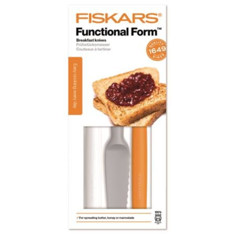 Reggeliző késkészlet, 3 darabos készlet, FISKARS Functional Form (IF1016121) Tökéletes eszköz vaj, méz és lekvár kenéséhez Az egyik oldalon fogazott élnek köszönhetően könnyedén vágható vele a croissant vagy egyéb péksütemény