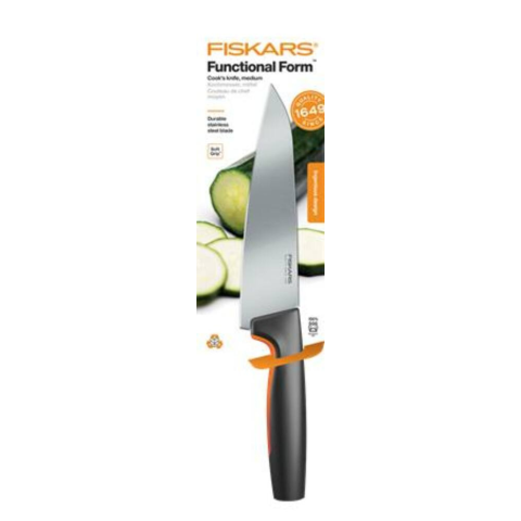 Szakácskés, közepes, FISKARS Functional Form (IF1057535) Közepes méretű általános kés erős pengével többféle vágási feladathoz. -tartós japán rozsdamentes acél penge -biztonságos ergonomikus markolat -mosogatógépben elmosható -kényelmes és könnyű hasz