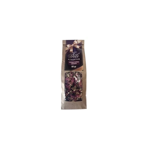Téli nyugalom teakeverék fekete teával, hibiszkusszal, kardamommal, citromfűvel, gyömbérrel és rózsaszirommal.