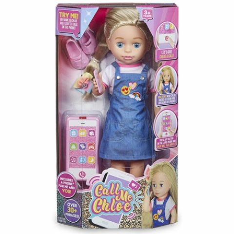 A Call me Chloe interaktív játékbaba egy nagyméretű beszélő baba, akivel sokat cseveghetnek a gyerekek telefonon. A dobozban két telefont található, egyik a gyerekeké, másikat Chloe használja, így valóban beszélhetnek vele. Helyezd a kezébe, majd karját emeld a füléhez és és több mint harminc különböző választ adva, kilenc témában lehet vele beszélgetni. Ezek a témák kis