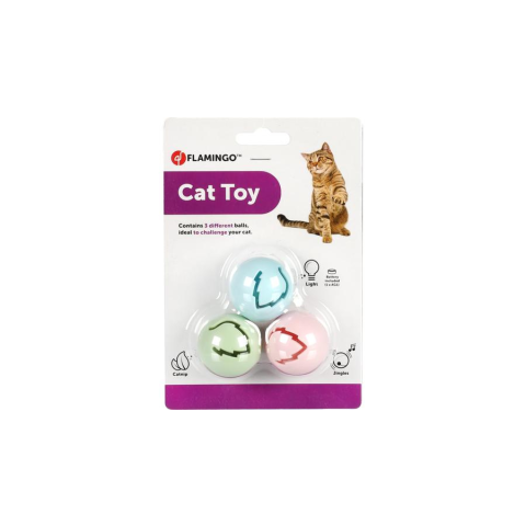 1 golyó csilingel, 1 golyó világít, 1 golyó pedig macskamentával van töltve.