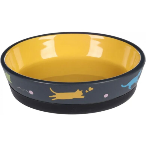 Sötét szürke és sárga színű kerámiatál macskák számára díszítéssel.