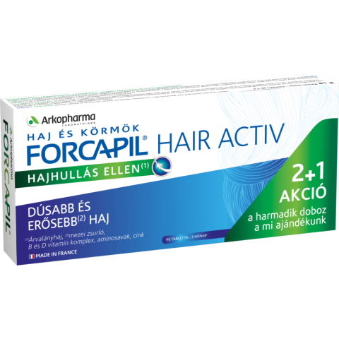 A Forcapil menüpontban található Forcapil Hair Activ Hajhullás elleni tabletta 90 db vitaminokkal, ásványi anyagokkal és gyógynövényekkel gazdagított, 3 havi adagot tartalmazó készítmény. Ajánlott nőknek és férfiaknak egyaránt, de kiváló hatást gyakorolhat a fáradtság ellen, nők esetében a menopauza után előforduló hajhullás esetén.