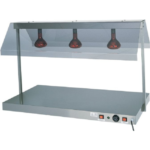 Inox kivitel, inox munkalap, 3 db infa lámpával, termosztatikus vezérlés (0-90 °C), főkapcsoló, jelzőlámpa. Teljesítmény: 0,6+0,75 kW/230V-1N~ Mérete: 1270x680x800 mm
