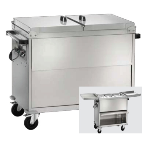 Vizes melegentartó, inox kivitel, termosztatikus vezérlés (30-90 °C), főkapcsoló, jelzőlámpa, alsó leeresztő csap, tolófogantyú, 2 db felső fedőpanel, amelyek 180°- ban nyithatóak, alsó nyitható tároló, önbeálló kerekek amelyből 2 db fékezhető. Kapacitás: 3xGN1/1 max. 200 mm mély edényzetnek - GN edényzet nélkül. Teljesítmény: 2,4 kW/230V-1N~ Mérete: 1300x680x1020 mm