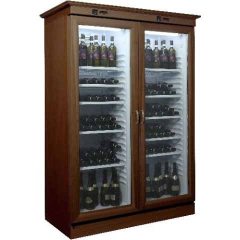 Fa szerkezet, 2 db fakeretes üveges ajtó, ABS fehér műanyag beltér, 45 mm nagy sűrűségű hőszigetelés, belső világítás, statikus hűtés hátfali alumínium elpárologtatóval, kompresszorra kötött belső ventilátor az egyenletes hőmérsékletért, 2 db ipari aggregát, termosztatikus vezérlés, automata leolvasztás és párologtatás 10 db 460x355 mm-es rácspolc. Hasznos űrtartalom: 310+310 liter Hűtés: +2/+8°C / +2/+8°C (max. +33°C/60% páratartalomig) Teljesí
