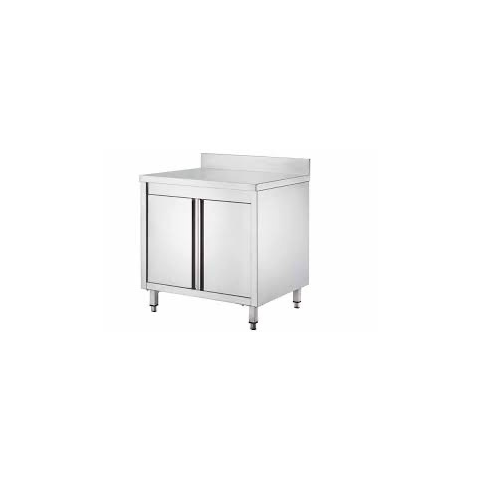 Inox 304 kivitel, rezgésmentes munkalappal, hátsó felhajtással,három oldalon burkolt, ajtóval, alsó és köztes polccal, műanyag szintezhető lábakkal. Mérete: 800x700x850 mm