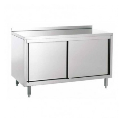 Inox 304 kivitel, rezgésmentes munkalappal, hátsó felhajtással,három oldalon burkolt, tolóajtóval, alsó és köztes polccal, műanyag szintezhető lábakkal. Mérete: 2000x600x850 mm