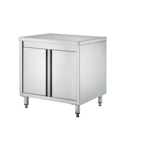 Inox 304 kivitel, rezgésmentes munkalappal, három oldalon burkolt, ajtóval, alsó és köztes polccal, műanyag szintezhető lábakkal. Mérete: 800x700x850 mm