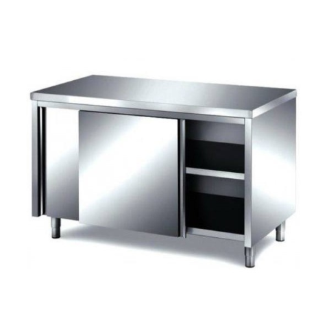 Inox 304 kivitel, rezgésmentes munkalappal, három oldalon burkolt, tolóajtóval, alsó és köztes polccal, műanyag szintezhető lábakkal. Mérete: 1400x700x850 mm