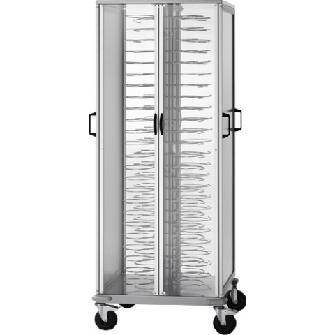 Fém váz, krómozott műanyag tartógyűrűk, 4 db nyitható plexi ajtó, oldalsó fogantyúk, gördíthető kivitel, 2 kerék fékezhető. Kapacitás: 96 db tányér Használható tányér átmérő: 180-230 mm Külméret: 750x780x1830 mm