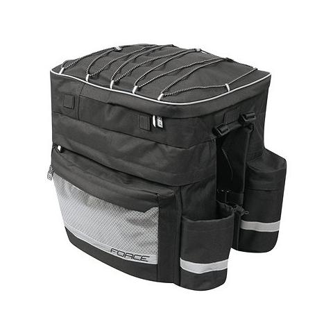 Kerékpáros táska - elhelyezése hátsó tartóra, térfogata 34 l, alkalmas bikepackinghez, ellátva pánttal, felső és oldalsó zsebek, fényvisszaverő elemek, pánt lámpa rögzítéséhez és gumipók, mélysége 37 cm, tömege 1,53 kg, fekete kivitel A Force Target hármas táska kiváló választás a többnapos kerékpártúrákhoz, mivel elegendő helyet biztosít minden szükséges dolog tárolásához. Három tágas rekesszel, három kisebb, az oldalakon és a tás
