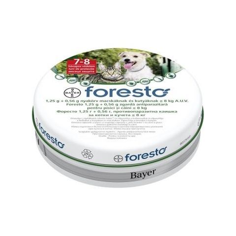 Foresto kullancs- és bolhanyakörv macskáknak és kistestű kutyáknak A KÉSZÍTMÉNY JELLEMZŐINEK ÖSSZEFOGLALÓJA 1. AZ ÁLLATGYÓGYÁSZATI KÉSZÍTMÉNY NEVEForesto 1,25 g + 0,56 g nyakörv macskáknak és kutyáknak ≤ 8 kg A.U.V.2. MINŐSÉGI ÉS MENNYISÉGI ÖSSZETÉTELHatóanyagok:Egy 38 cm-es nyakörv (12,5 g) 1,25 g imidakloprid és 0,56 g flumetrin hatóanyagot tartalmaz.A segédanyagok teljes felsorolását lásd: 6.1 szakasz.3. GYÓGYSZERFORMAGyógyszeres nyakörvSzürke, szag