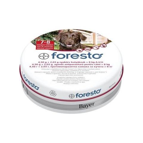 Foresto kullancs- és bolhanyakörv nagytestű kutyáknak A KÉSZÍTMÉNY JELLEMZŐINEK ÖSSZEFOGLALÓJA 1. AZ ÁLLATGYÓGYÁSZATI KÉSZÍTMÉNY NEVEForesto 4,50 g + 2,03 g nyakörv kutyáknak >8 kg A.U.V. 2. MINŐSÉGI ÉS MENNYISÉGI ÖSSZETÉTELHatóanyagok:Egy 70 cm-es nyakörv (45 g) 4,5g imidakloprid és 2,03 g flumetrin hatóanyagot tartalmaz. A segédanyagok teljes felsorolását lásd: 6.1 szakasz.3. GYÓGYSZERFORMAGyógyszeres nyakörvSzürke, szagtalan nyakörv4. KLINIKAI JELLEMZŐ
