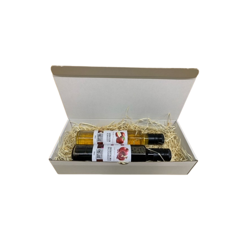 Gránátalma balzsamecetet és szűretlen almaecetet tartalmazó gourmet csomag.