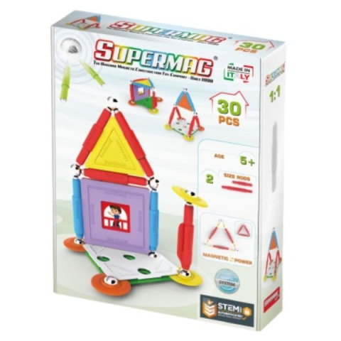 Különleges mágneses építőjáték kicsiknek és nagyoknak! A Supermag Projects House 30 darabos készlete egy nagyon egyszerű, mégis rendkívül szórakoztató és sok lehetőséget rejtő, mágnesességen alapuló építőjáték szett, amellyel a gyerekek egy házat építhetnek meg. A készlet két fő alkotóeleme a mágneses pálcák és a rozsdamentes acélgolyók, amelyek segítségével a kis építők könnyen megépíthetik álmaik házát. A pálcák különlegessége, hogy ké