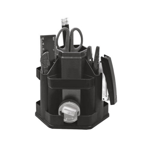 Írószertartó Forofis 14 részes műanyag fekete forgatható 14 darabos íróasztali készlet egy praktikus és elegáns megoldás az irodai eszközök rendszerezésére. A fekete műanyagból készült készlet tartalmazza az összes alapvető irodai eszközt, amelyre szük