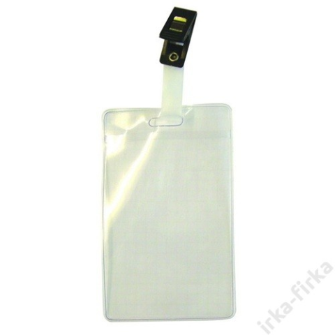 Átlátszó, lágy műanyagból készült álló formátumú névjegykitűző csiptetővel. Méret: 65 x 105 mm.